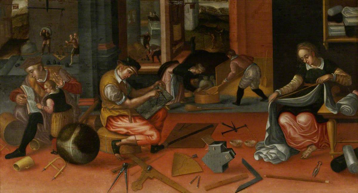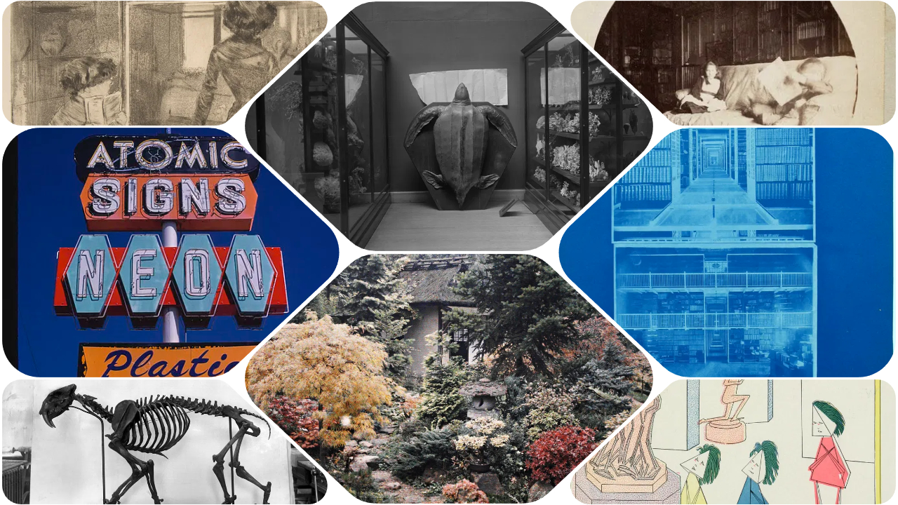 Collage of historic images and artworks relating to galleries, libraries, archives, and museums